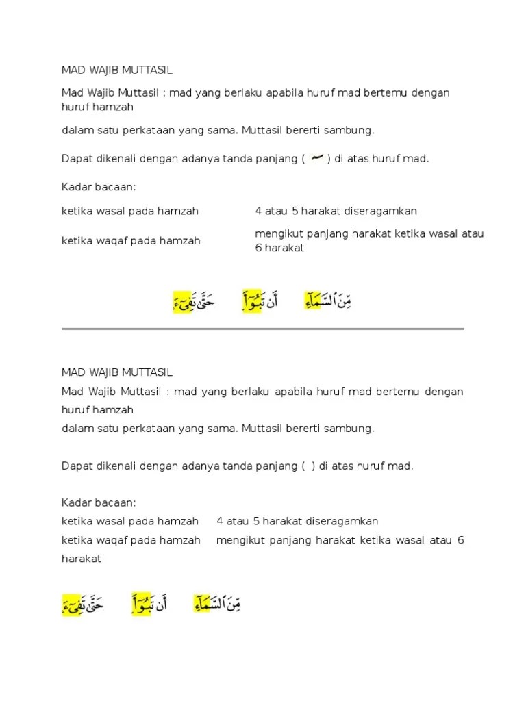 · " wajib " is an arabic word which means "mandatory" . Pengertian mad wajib muttasil adalah ketika mad asli atau . Mad wajib muttasil adalah mad thabi'i yang bertemu dengan hamzah (ء) dalam satu kalimat. Secara istilah, mad wajib muttasil adalah hukum bacaan yang terjadi apabila ada mad thabi'i (mad asli) bertemu dengan huruf hamzah yang .